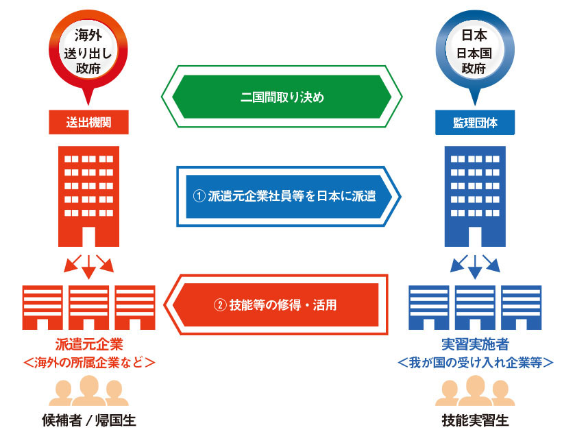 事業協同組合や商工会等の営利を目的としない団体(監理団体)が技能実習生を受け入れ、傘下の企業等(実習実施者)で技能実習を実施する方式